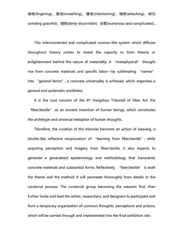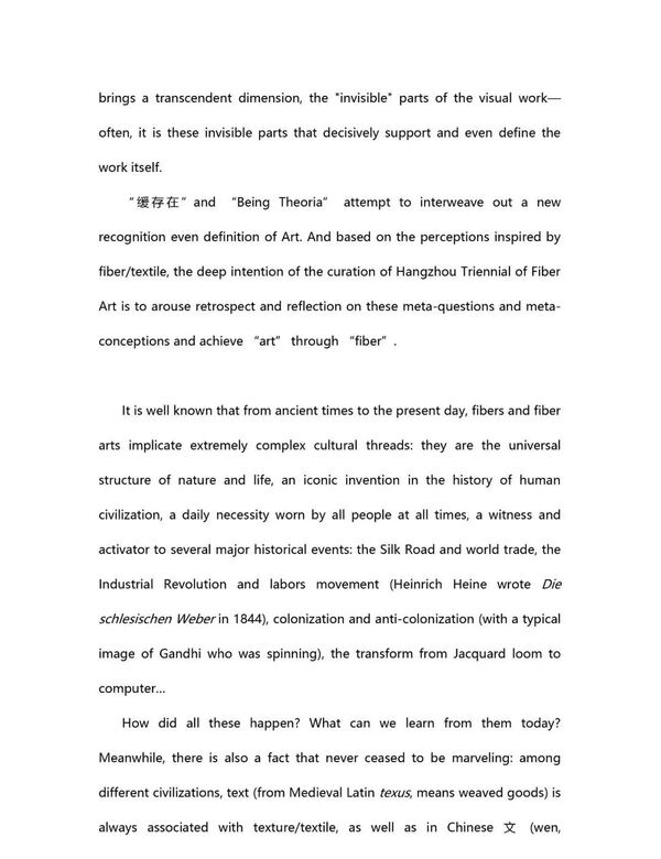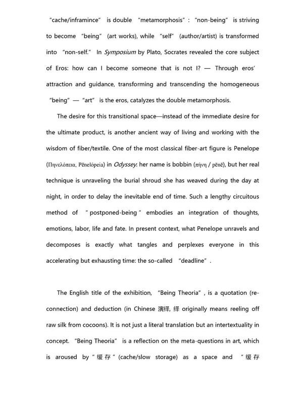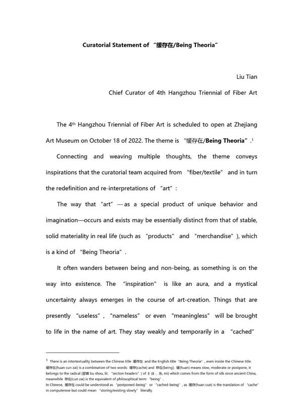 Drawing inspirations from fiber/textile, the curatorial team of the 4th Hangzhou Triennial of Fiber Art propose the term "缓存在 (Huǎn Cún Zài)" to suggest a redefinition and a re-interpretation of "art": the way "art" occurs and exists is a kind of "theoria-being".