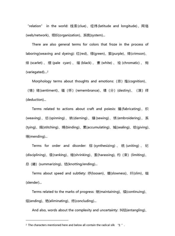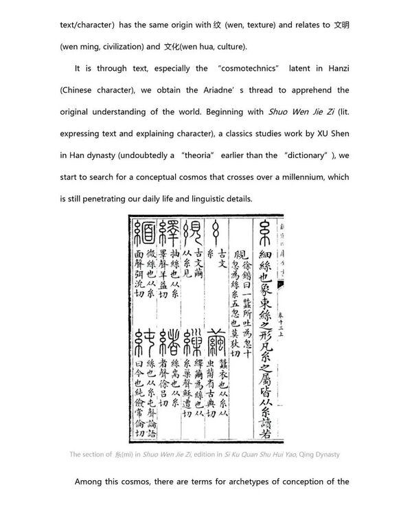 There is a "cosmotechnics" inherent in Mì/Sī (糸/纟), the radical for "silk" in the Chinese language, such as the archetypes in conceptions of "relation": clue (Xiànsuǒ / 线索), organization (Zǔzhī / 组织), web/network (Wǎngluò / 网络), system (Xìtǒng / 系统); the general name of colours: red / 红, green / 绿, purple / 紫, scarlet / 绯, crimson / 绛; and "Wén / 文(纹)", which means, together in one word, text, texture, culture, and civilization. These come from the form of silk since the time of ancient China, alert us that fiber/textile is the basic construction of the world, as well as the phenomenon of and universal metaphor for human thought.