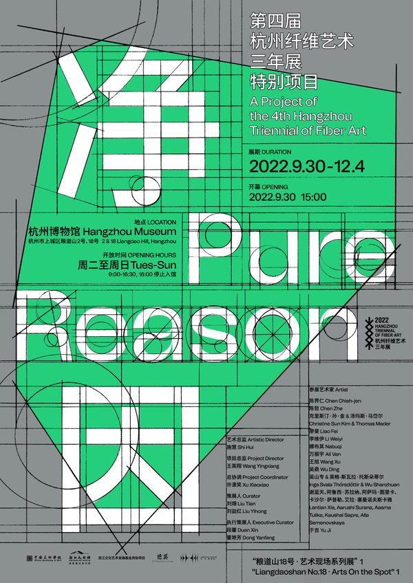 Taking place from 30 September to 4 December 2022 at the Hangzhou Museum, as a special project of the 4th Hangzhou Triennial of Fiber Art in 2022,"净因 | Pure Reason"invited 12 worldwide artists/groups to create works in the museum's open-air and indoor non-exhibition spaces around the Five Dynasties "Jingyin Temple" stone pagoda pedestal housed in the collection of the project partner Hangzhou Museum.