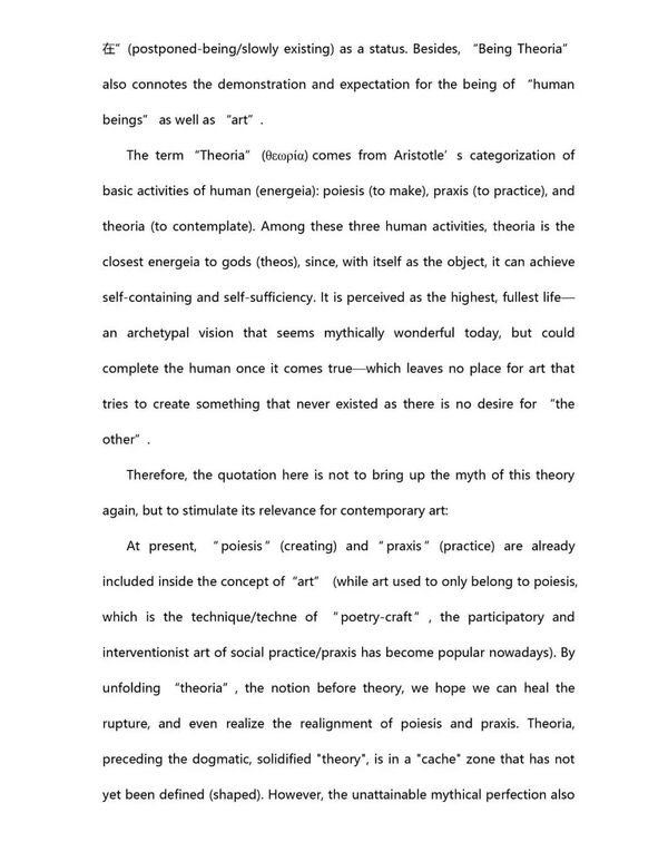 This is echoed in the English translation, "Being Theoria", which itself derives from Aristotle’s "theoria" (contemplation) from the time of ancient Greece. Poesis (techne) / praxis / theoria come from the "three activities" categorized by Aristotle. "Being Theoria" reacts to the divide between art emphasizing production (techne) and art emphasizing participation and intervention (praxis) today.