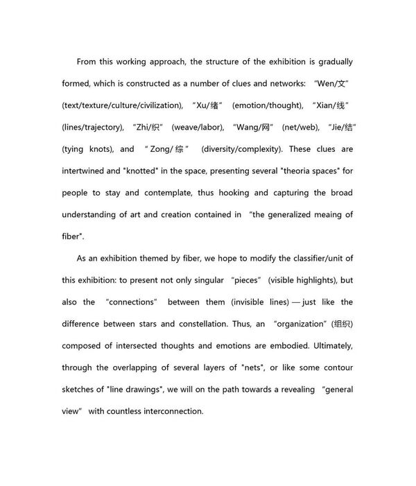 From the initial moment, the curatorial team has defined itself as "weavers", inviting artists and scholars to join in and establish connections, and form a network of Research Weavers responding to a reflective fiber-world. The triennial is not segmented but linked up through several "clues", viz. characters with the silk radical: "Wén / 文" (text / texture / culture / civilization), "Xù / 绪" (emotion / thought), "Xiàn / 线" (lines / trajectory), "Zhī / 织" (weave / labor), "Wǎng / 网" (net/web), "Jié / 结" (tying knots), and "Zōng / 综" (diversity / complexity). These clues are intertwined in space and are presented as a series of immersive "Theoria Space" for people to linger in and meditate.