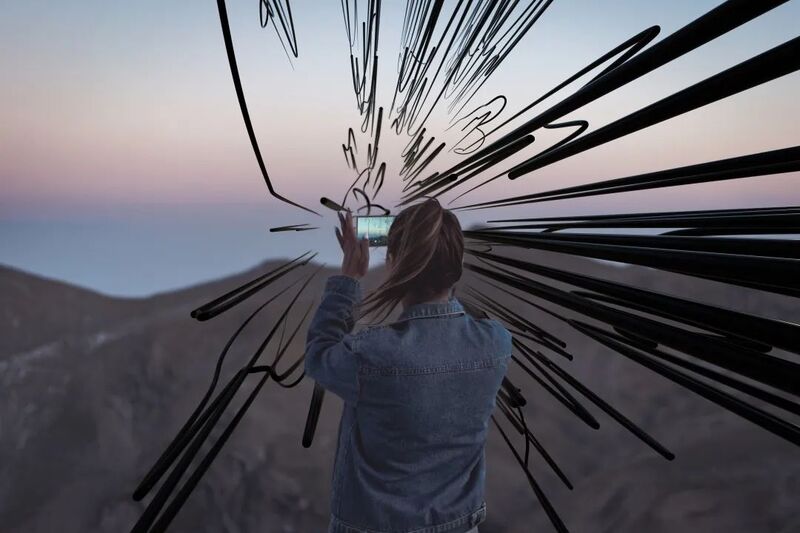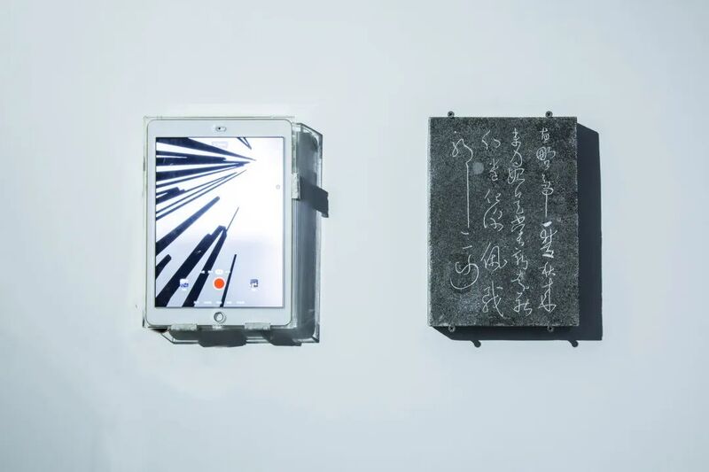 李维伊在博物馆中思考“纤维”——她将书法的笔触转义为一根等宽的线条在三维空间中运动,在透视中形成粗细的变化,并使用三维软件“临摹”了王羲之的《尝新帖》。于是,你将会看到,一块白色的AR平板电脑,与另一块等大的黑色石板(字帖的石刻),并置在博物馆的墙面上。人们可以使用手持设备置身于线条的进退之中,在虚拟环境中游历这件空间中的书法作品。