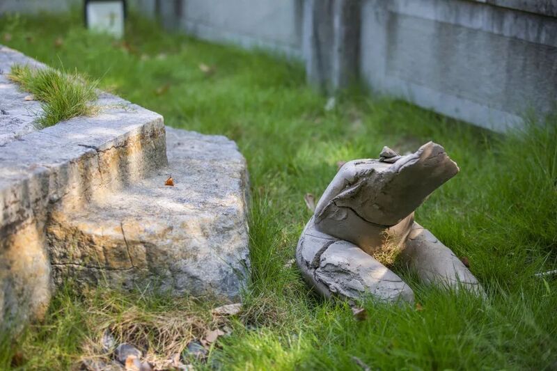 于吉的《石肉》系列回应了造像的悠久传统。多个水泥身体像被遗弃的物质,又像历史遗址中的残骸,其造型来自于吉多年来对中国、柬埔寨和印度古代雕塑的研究和现场考察,其中的两尊被不显眼地安置在净因石塔基座旁的草丛中,另一尊则被置于一个新造的铁锈基座之上——这一基座的造型仿佛是空缺的五代石塔基座之“负形”,散布的雕塑,共同在虚空中勾勒出了多个不同的多边形。在户外的湿润环境中,雕塑的表面已长出青苔,并将在展出期间继续生长。