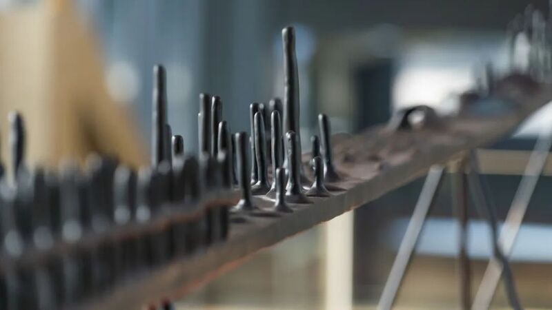 在户外的广场上,陈哲的《观星者》在日光下投射出遥望。地面星罗棋布的金属图阵,参照了现存最古老的关于宇宙的描绘——内布拉星象盘(Nebra Sky Disk)所设置;最原始的生长元素——植物之藤与动物之骨从斑驳的黑色金属纠缠上升,形成日晷般的图腾柱指向天空。艺术家说:“从仰望星空并为之神迷的那一刻起,生命继承了自身”。