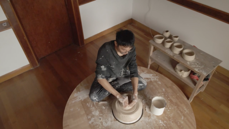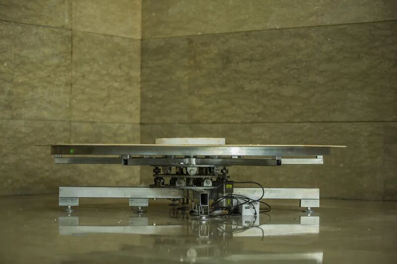 步入杭博,展览继续在各个不同的非展厅公共空间中继续。《向心》,是王旭为“净因 | Pure Reason”计划在景德镇完成的最新创作。他反转了捏制陶土泥胚的旋转方式:泥胎被静止地固定在一个圆盘的中心,艺术家则盘腿坐于圆盘的外侧,通过一台自制的机械装置带动,绕着泥胚旋转,并完成手工拉坯制作陶器的全过程,进而制造“当其无,有器之用”的虚无(Nichts)。在旋转之中,身体感受到向外释放的离心力,同时,和泥土的摩擦则需要身体向内释放相反的力。以此“向心”与“离心”,艺术家向“净因”石塔基座杳杳空缺的中心致敬。
