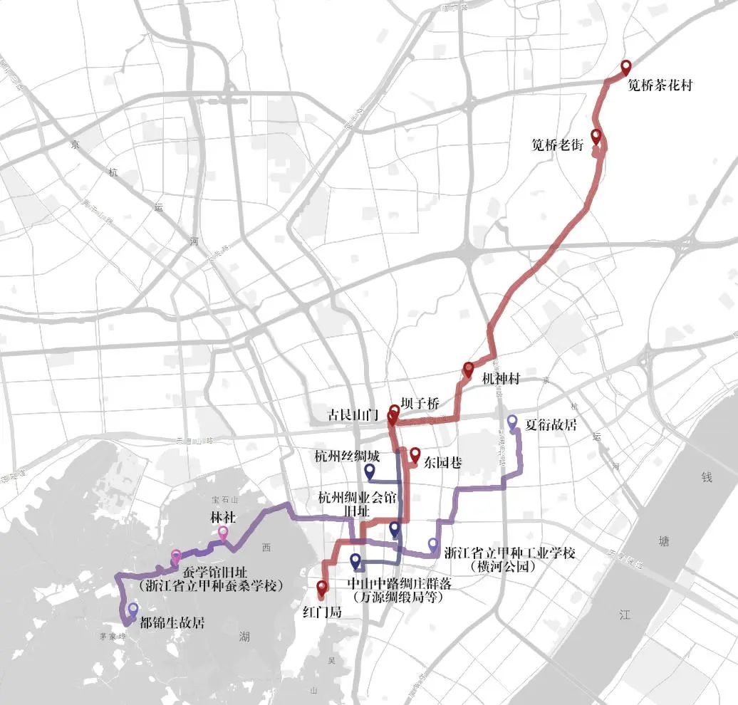 路线:都锦生故居——蚕学馆旧址\浙江省立甲种蚕桑学校——林社——浙江省立甲种工业学校(横河公园)——夏衍故居